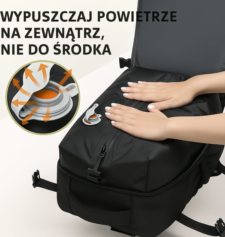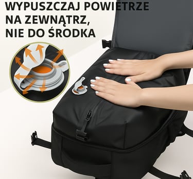 Specjalny zawór wypuszcza powietrze z plecaka, dzięki czemu zawartość naturalnie się spłaszcza, a Ty zyskujesz dodatkową przestrzeń — bez konieczności używania pompki.