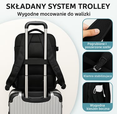 Składany system Trolley pozwala przypiąć plecak do walizki, a pogrubione szelki, klamra stabilizująca i oddychające plecy 3D zapewniają komfort nawet przy pełnym obciążeniu. Wzmocnione uchwyty i klamry gwarantują trwałość na lata.